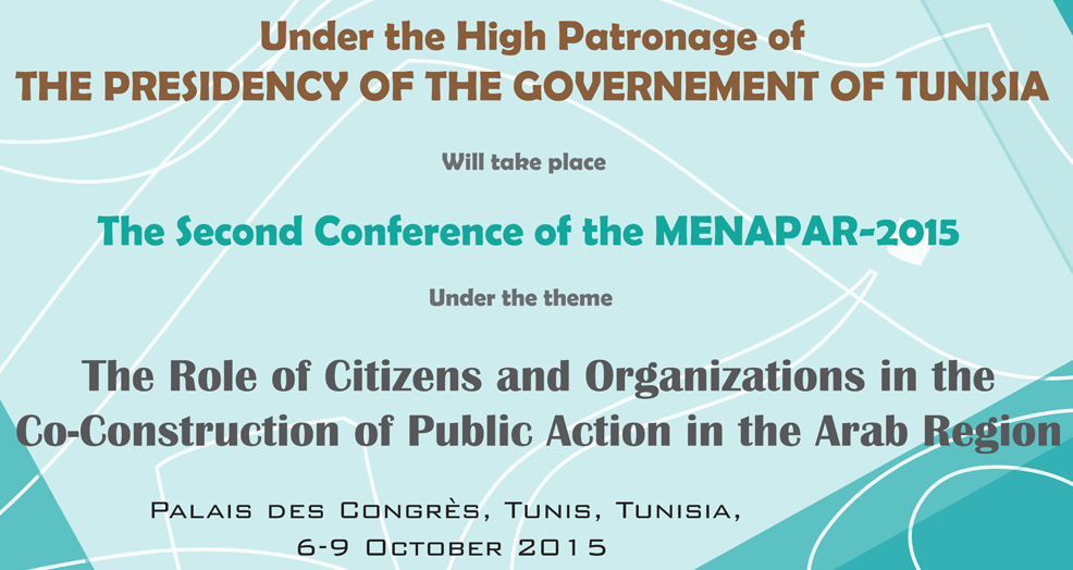 وينعقد المؤتمر بتونس العاصمة في قصر المؤتمرات بشارع محمد الخامس أيام 6 الى 9 أكتوبر 2015 تحت عنوان “ دور المواطنين والمنظمات في البناء المشترك للعمل الحكومي بمنطقة الشرق الأوسط وشمال إفريقيا”.