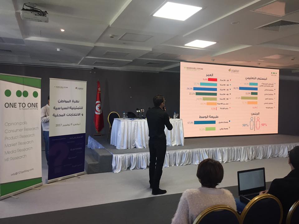 قدّمت منظمة “مراقبون” صباح يوم الخميس 9 نوفمبر 2017 خلال ندوة صحفيّة عُقدت بفضاء نزل المشتل بتونس العاصمة، نتائج الاستبيان المتعلّق بالتّمثيليّة السّياسيّة والانتخابات المحليّة والذي تمّ إجراؤه خلال الفترة المتراوحة بين 28 جوان و28 أوت 2017 بسبر آراء شارك فيه أكثر من 10 آلاف تونسيّ ممّن هم فوق سن الثّامنة عشر في 24 ولاية و260 معتمديّة و749 عمادة وأكثر من 800 نقطة معاينة.