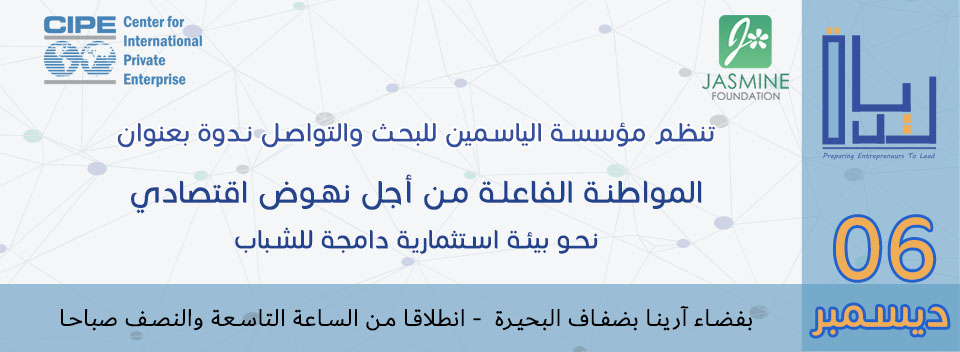 للمجتمع المدني دور هام، في ظل الديمقراطية، في المساهمة في ترشيد وتوجيه هذا الإصلاح عبر اقتراح حلول واقعية وخلق مبادرات عملية تساعد في مواجهة التحديات الاقتصادية والاجتماعية. وقد نفذت مؤسسة الياسمين في هذا الصدد مشروعا ميدانيا بالشراكة مع “مركز المشروعات الدولية الخاصة” (CIPE) بغاية دراسة واقع البيئة الاستثمارية من وجهة نظر باعثي المشاريع الشبان وتقديم مقترحات عملية نابعة من احتياجاتهم، وذلك عبر: