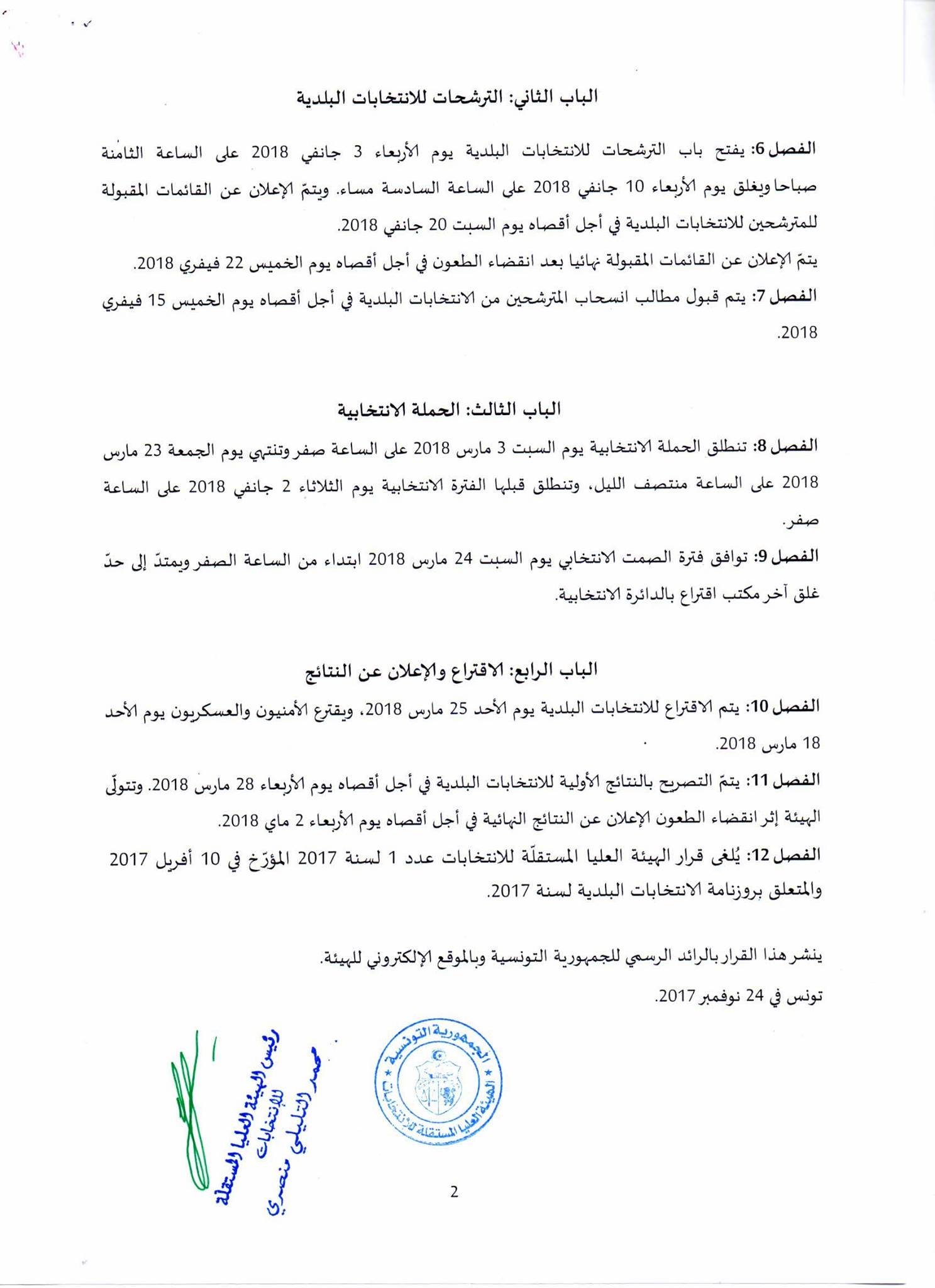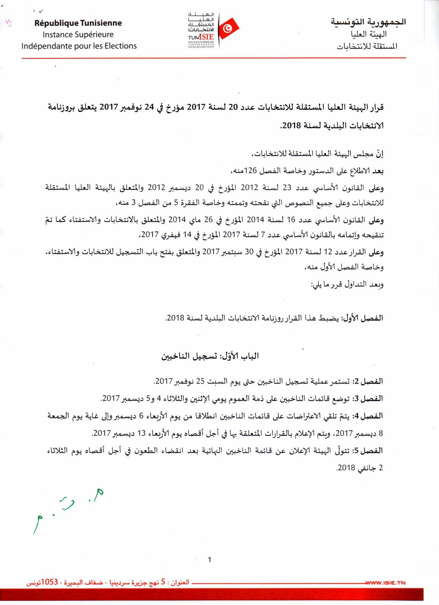 نشرت الهيّئة العليا المستقلّة للانتخابات مساء يوم الجمعة 24 نوفمبر 2017 قرارها عدد 20 المتعلّق بروزنامة الانتخابات البلديّة لسنة 2018، المتكوّن من أربعة أبواب عن تسجيل النّاخبين والتّرشّحات للانتخابات البلديّة والحملة الانتخابيّة كذلك عن الاقتراع والإعلان عن النّتائج.
