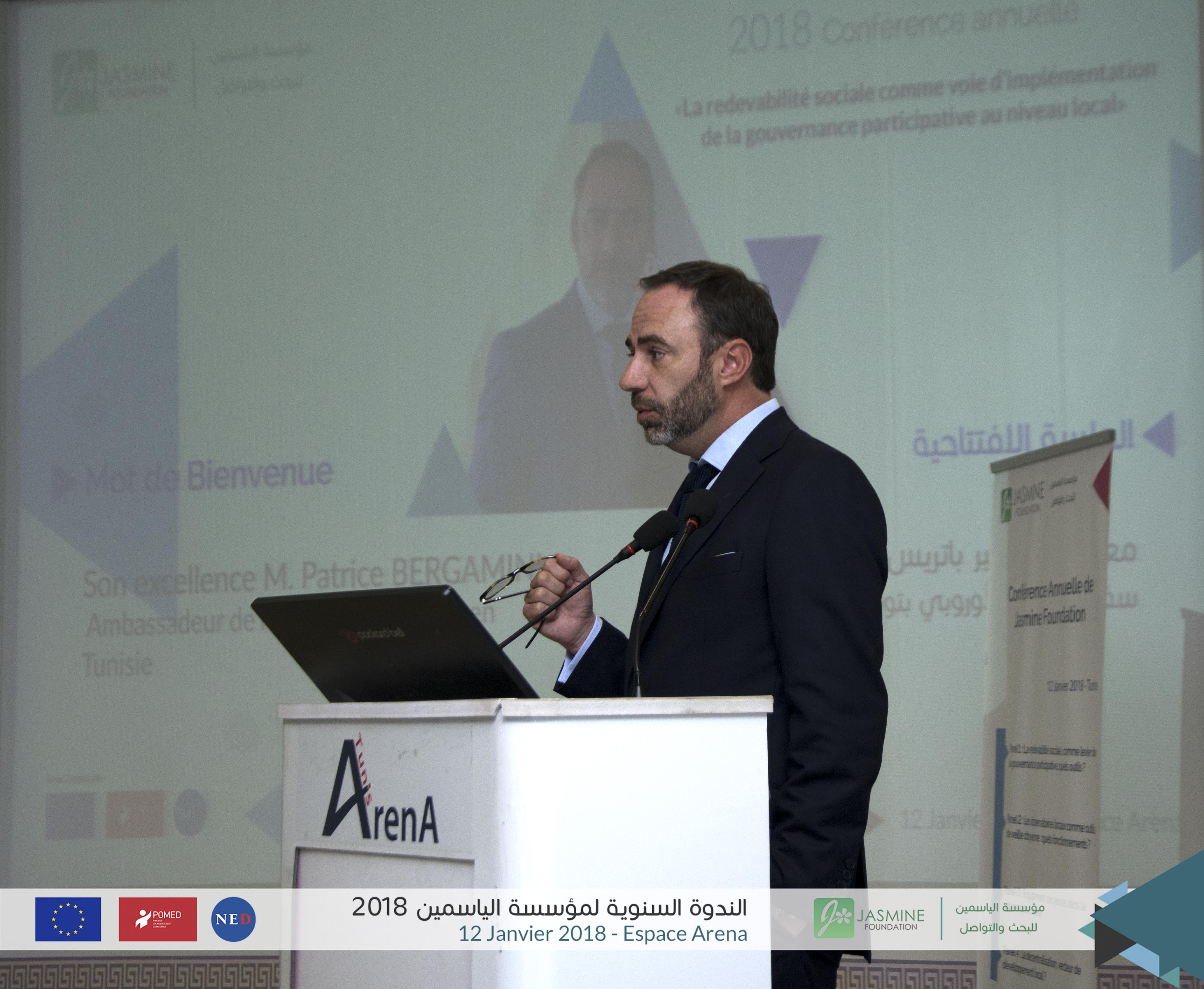 وتم بعد ذلك تقديم أهم نتائج المشروع الذي نجح في تكوين أكثر من 600 شاب وشابة من ولايات تونس الكبرى، قبل أن يتم المرور إلى افتتاح أشغال حصص النقاش حيث أسندت الكلمة إلى السيّد باتريس بيرغاميني، سفير الاتحاد الأوروبي بتونس، الذي أشاد بالمجهود والعمل الذي قدّمته مؤسسة الياسمين خصوصا في حشد الشباب والعمل معهم وتكوينهم في مجالات الحوكمة المحلية والمساءلة الاجتماعية، مشيرا إلى المرحلة الدقيقة التي تعرفها تونس على درب الانتقال الديمقراطي والتي لا بدّ أن يحمل مشعلها الشباب حتى تكون تجربة مثمرة وناجحة ومؤسِّسة.