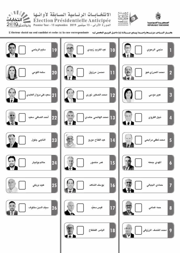منجي الرحوي / محمد عبو / عبير موسي / نبيل القروي / لطفي المرايحي/ مهدي جمعة/ حمادي الجبالي /حمه الهمامي/ منصف المرزوقي / عبد الكريم الزبيدي / محسن مرزوق / محمد النوري / الهاشمي الحامدي /عبد الفتاح مورو / يوسف الشاهد / عمر منصور / قيس سعيد / إلياس الفخفاخ / سليم الرياحي / سلمى اللومي / سعيد العايدي / الصافي سعيد/ الناجي جلول/ حاتم بولبيار / عبيد البريكي / سيف الدين مخلوف.