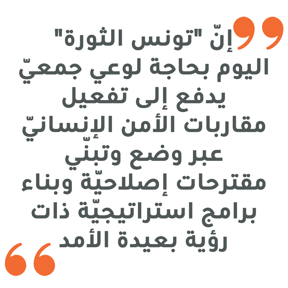 إنّ “تونس الثورة” اليوم بحاجة لوعي جمعيّ يدفع إلى تفعيل مقاربات الأمن الإنسانيّ (الأمن الغذائيّ، الأمن السياسيّ، الأمن الروحيّ، الأمن البيئيّ، الأمن المجتمعيّ، الأمن الشخصيّ، …) عبر وضع وتبنّي مقترحات إصلاحيّة وبناء برامج استراتيجيّة ذات رؤية بعيدة الأمد. هذا ما يضمن الذّهاب في طريق تحرير الإنسان من مخاوفه المختلفة المتداخلة، بعد أن تحرّر إثر ثورته المجيدة من حاكم دكتاتور متسلّط.