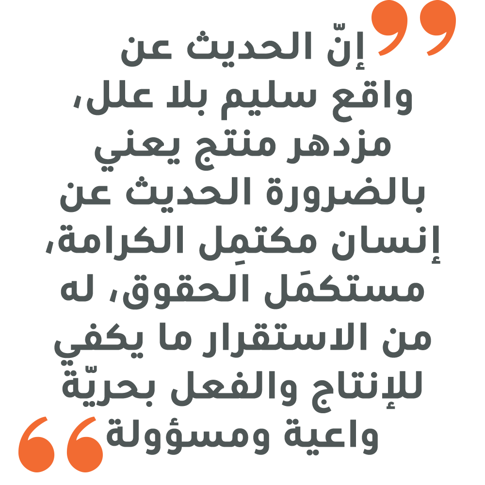 إنّ الحديث عن واقع سليم بلا علل، مزدهر منتج يعني بالضرورة الحديث عن إنسان مكتمِل الكرامة، مستكمَل الحقوق، له من الاستقرار ما يكفي للإنتاج والفعل بحريّة واعية ومسؤولة. لذا فإنّ إصلاح الواقع الوطنيّ اليوم يستوجب بالأساس معالجة حالات عدم الاستقرار الماديّ والمعنويّ الإنسانيّ. وهذه الحالات لا تنفع معها الحلول الجاهزة قصيرة المدى الهدف منها تزيين الشروخ قبل رأبها ومداواة الأرواح المكلومة عبر مناولتها مسكّنات. فالعمل من أجل واقع ذي أرضيّة صلبة تقي الإنسان التهديدات الماديّة والمعنويّة يستوجب بداية؛ المعرفة، فالإدراك ثمّ فهم العلائق بين مختلف المسبّبات والظواهر المنتَجَةِ.