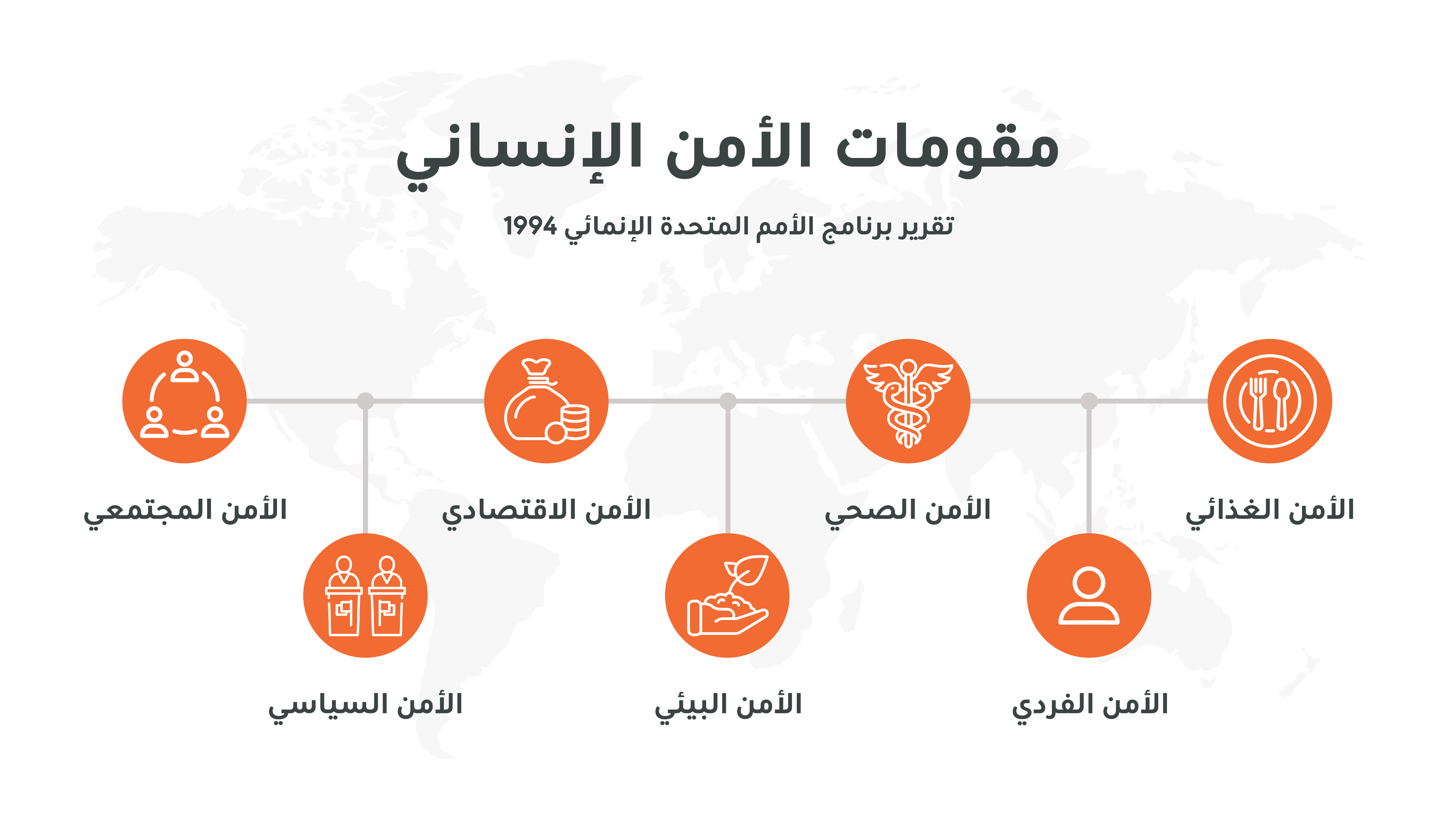 مذ ما يزيد العقدين صدر تقرير عن الأمم المتّحدّة ليعرّف فكرة الأمن الإنساني التي فكّكت مفهوم الأمن لسبع محاور وهي كالآتي: الأمن الغذائيّ والأمن الصحيّ والأمن الاقتصاديّ والأمن المجتمعيّ والأمن الفرديّ والأمن البيئيّ والأمن السياسيّ. هذه المحاور السبعة تفرّعت عبر سلّم التّاريخ الزمنيّ وعبر حيّز المكان الجغرافيّ لتغطّي حاجيات الإنسان المختلفة كالرّوحيّ والفكريّ.