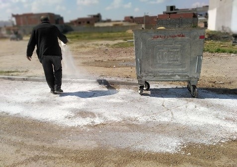 وفي مرحلة ثانية، قمنا بتعقيم الحاويات بمادَة الجير، فالجير يقتل مختلف الفيروسات وعديد البلديَات في ولاية المنستير نسجت على منوالنا نظرا إلى فاعليَة مادَة الجير في قتل الفيروسات.